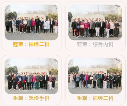 经过激烈角逐,神经二科团队荣获冠军,综合内科获得亚军,急诊手供团队、神经三科团队并列获得季军。参赛人员和院领导留下了一张宝贵的全家福,为此次活动画下了完美的句号。