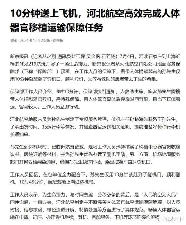 媒体报道了这样一件事情,河北石家庄到上海虹桥NS3219航班开展了一场生命接力。