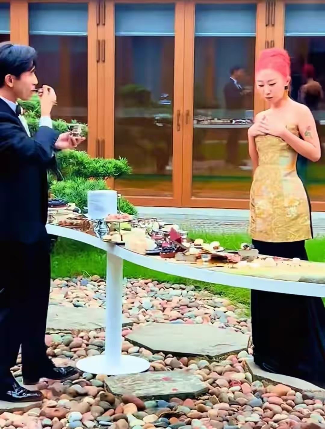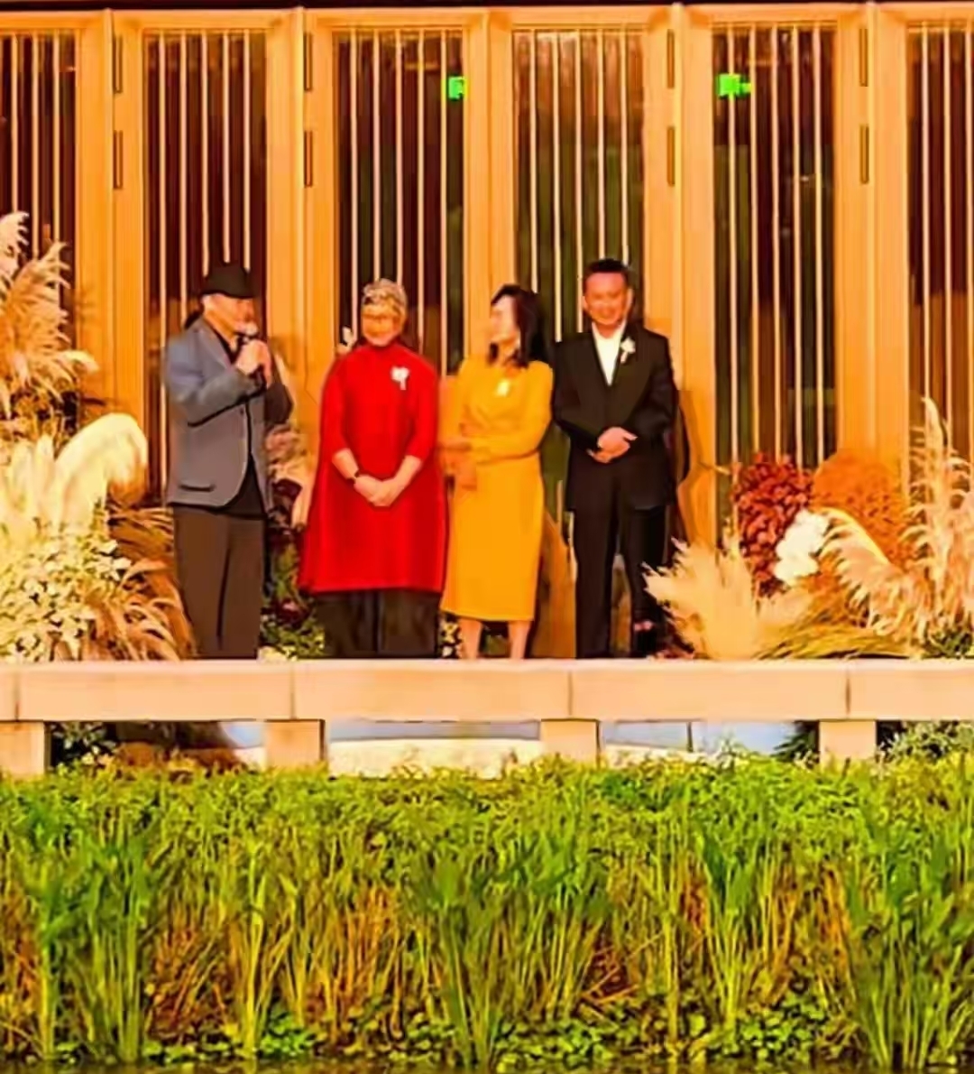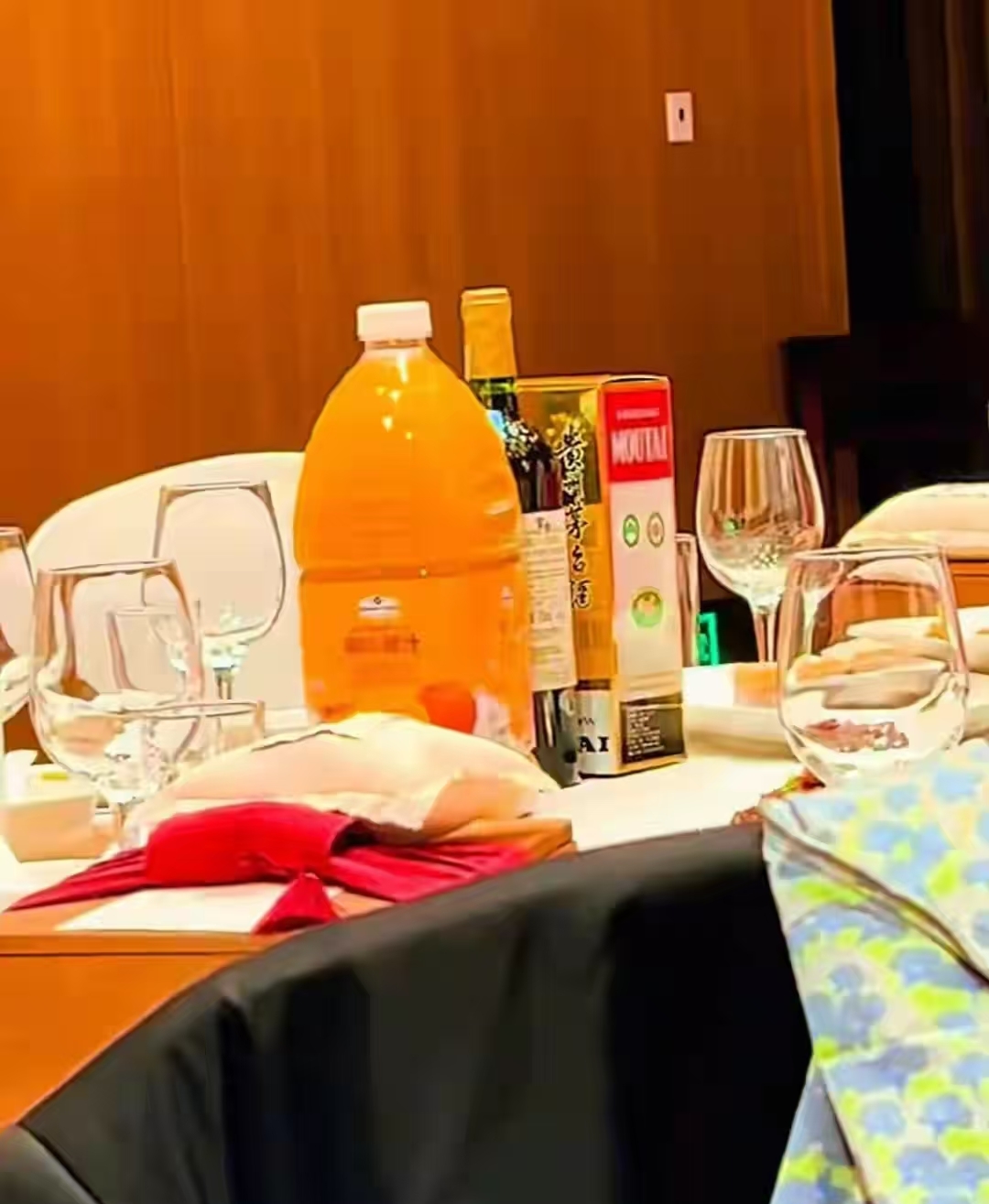 酒席还挺丰盛,茅台和葡萄酒、饮料样样齐全。刘欢和新娘胸前戴白花,不是应该戴红花吗?可能是按照西方人的习惯戴的花。