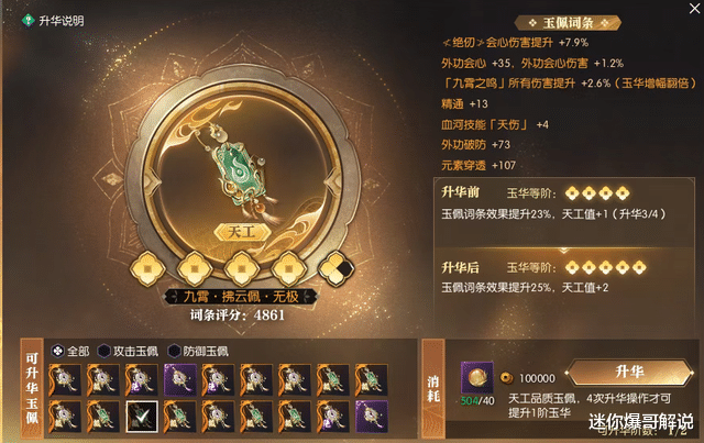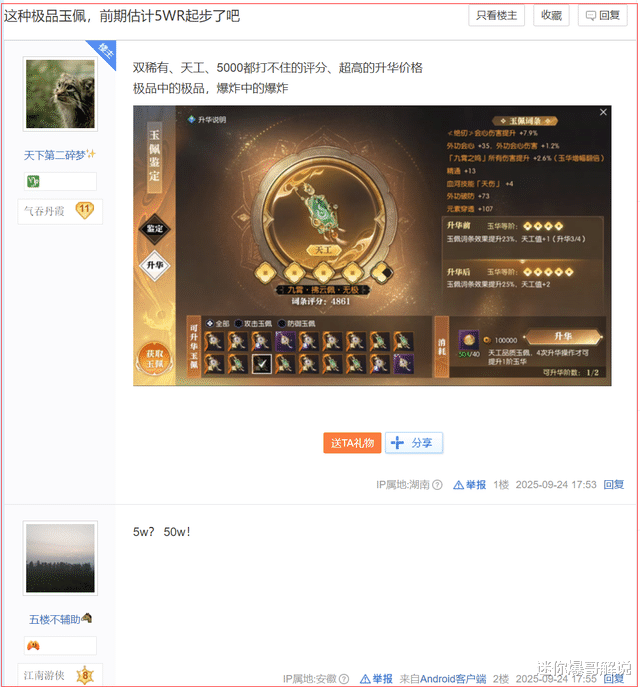 还有玩家晒出自己切了一半的极品玉佩胚子,切一半就切出了双稀有词条、天工等等,目前的估价就已经达到了5万人民币,要是运气再好一点出稀有词条,那50万人民币都刹不住车!