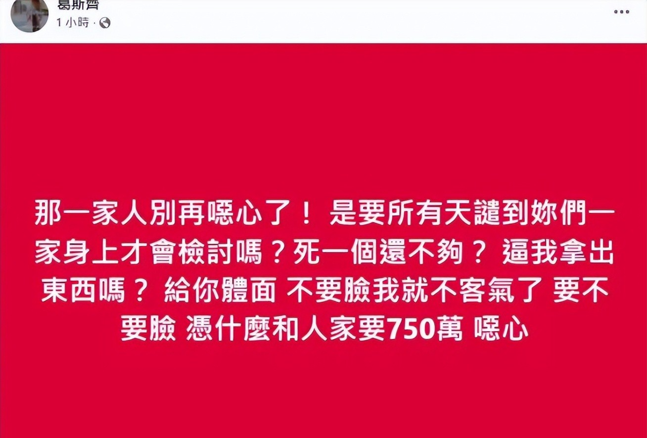 遗愿风波将这种畸形关系暴露无遗。狗仔曝光的聊天记录显示,大S临终前已与过往恩怨和解,对子女抚养做出清晰安排。但S妈妈却在前女婿致电时爆发激烈争吵,这与遗愿中"希望前夫照顾孩子"的嘱托形成刺眼反差。更耐人寻味的是,在遗产分配尚未明晰时,750万债务纠纷再次被摆上台面。这些细节拼凑出的图景,恰如吴宗宪所言:"在利益面前,亲情的天平难免倾斜。"