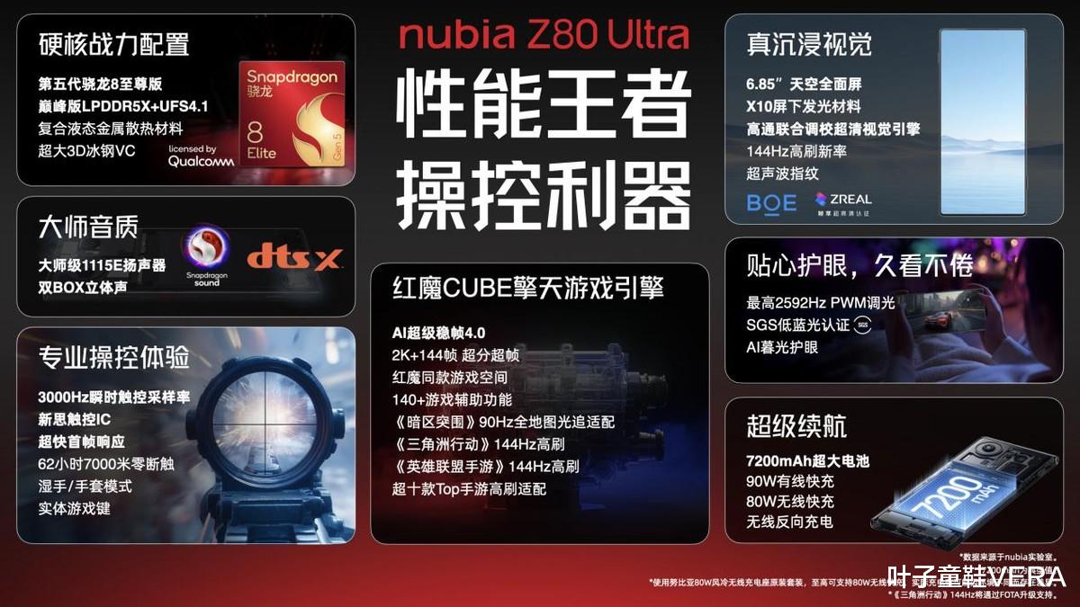 新机搭载6.85英寸业界独家天空全面屏,升级X10发光器件,支持高刷新率与触控采样率,与高通联合调校超清视觉引擎,带来沉浸式游戏视觉观感。新思触控芯片和全链路触控优化,让操控更自如,大师级扬声器带来震撼音质。7200mAh第四代南海电池配合AI“零”耗电技术,续航持久。同时,努比亚Z80 Ultra与多款游戏展开生态合作,实现光追适配、高刷新率等优化,让游戏体验更丝滑。