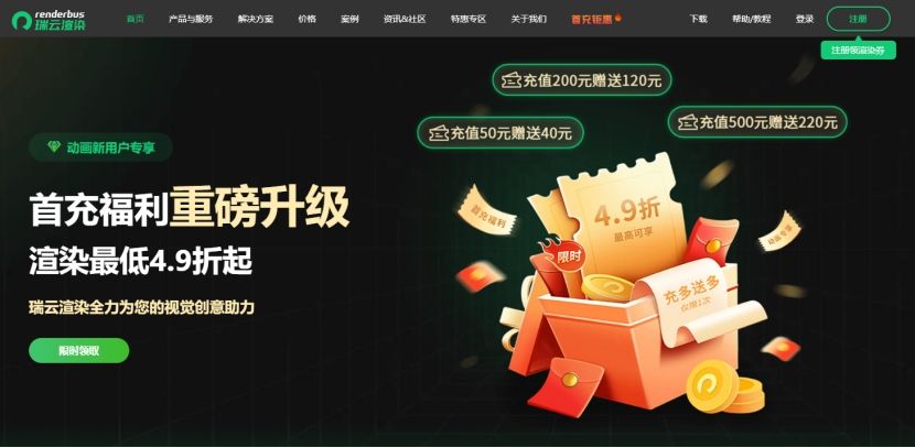 (4)善用新用户福利瑞云为动画新用户提供30元免费测试券,和限时首充50送40活动,建议先用免费额度测试