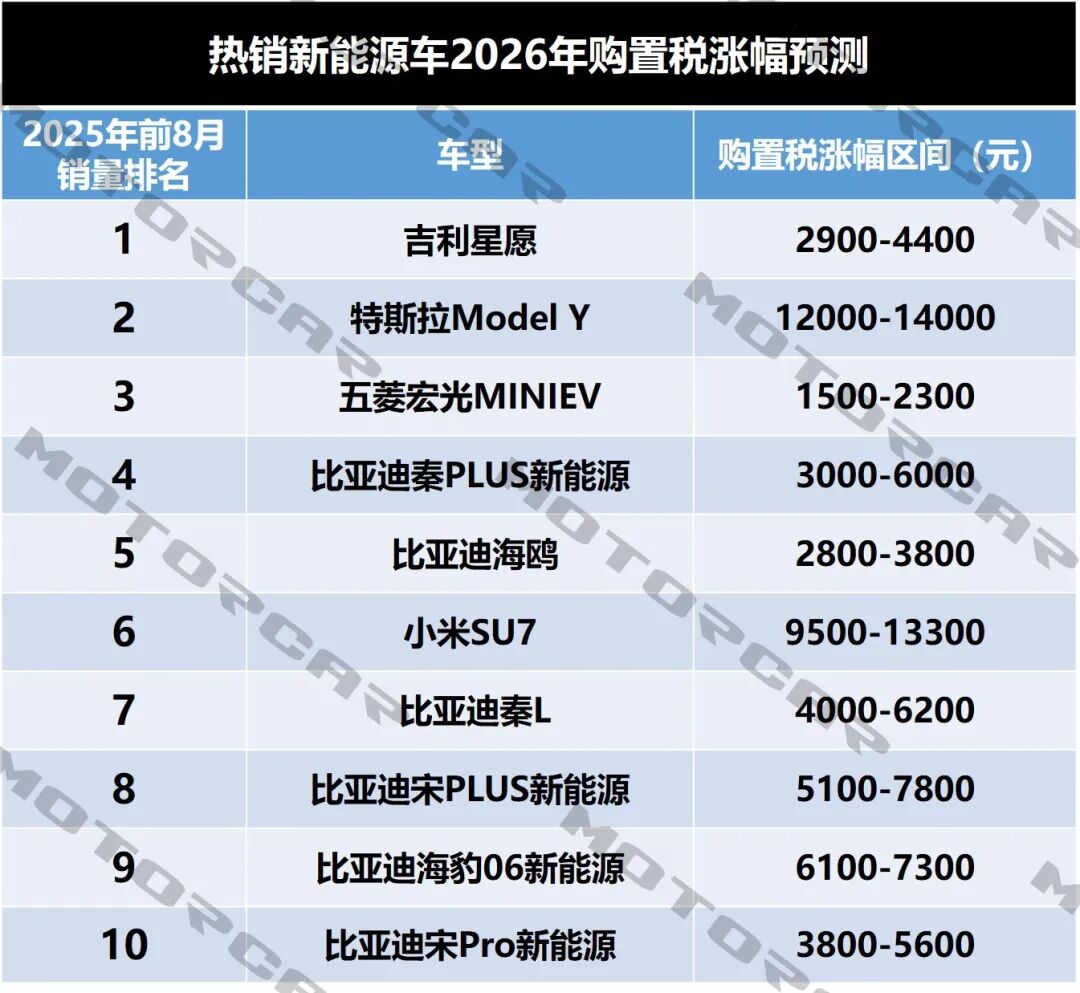 先看最亲民的微型车阵营。前八个月销量排在新能源车第三的五菱宏光MINIEV,现在裸车价大多在3万-5万,按购置税计算公式算下来,2026年提车得比现在多花1500元到2300元。