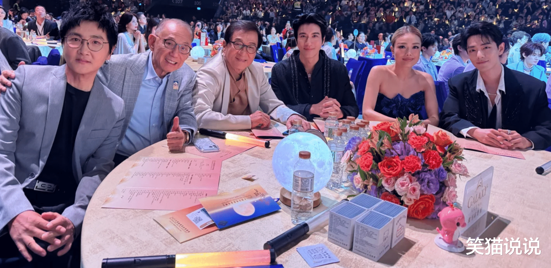 在照片中可以看到成龙坐在c位的位置,他穿着咖色的打底衫,外搭卡其色的西装外套,戴着眼镜,面色红润,看起来状态很不错。坐在他身边的杨受成则是穿着一身灰色的西装外套,他坐在桌前,对着镜头竖起大拇指拍照。孙楠戴着眼镜,多了几分书香气,他坐在杨受成的旁边,靠向他们合照。坐在成龙身边的王力宏就是穿着一身黑色的衣服,依然十分帅气,容祖儿穿着一身蓝色抹胸裙,显得很优雅大气。坐在容祖儿身边的肖战穿着一身黑色休闲的西装,看起来很温柔帅气,这张照片确实是可以说得上是阵容强大。