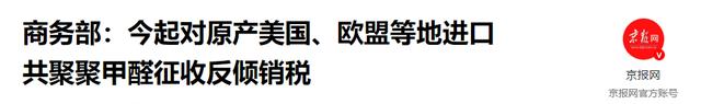 就在特朗普结束中东之行返回美国后,5月18日,中国商务部突然宣布了一项关于反倾销税的新政策,决定从5月19日起,对原产于美国、欧盟、台湾地区和日本的进口共聚聚甲醛征收反倾销税,最高税率可达到74.9%。