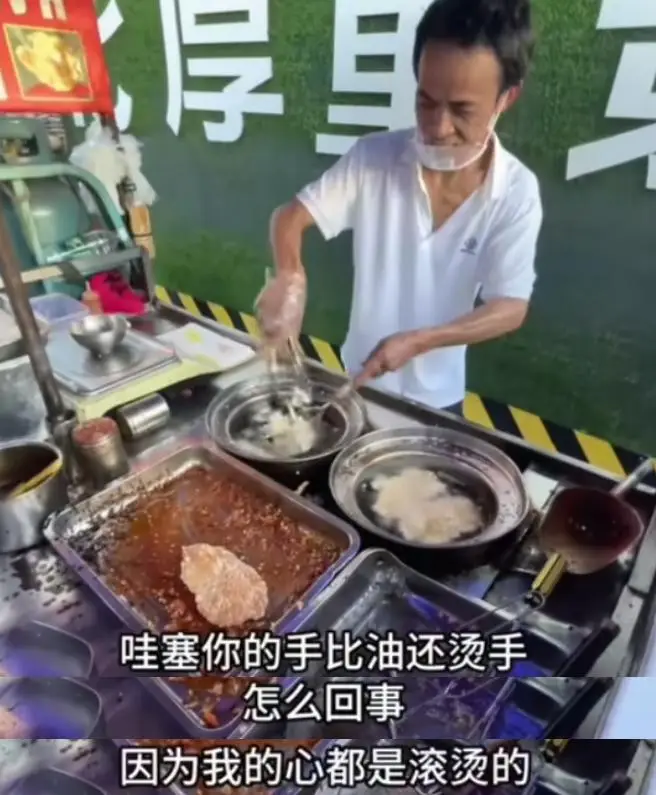 有顾客不小心碰到他正在忙碌的手,被高温烫得惊叫,他却轻松化解:“我的手是烫的,但我的心更烫啊!”一句话,逗得全场哈哈大笑。