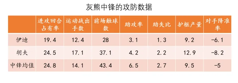 而从灰熊中锋的攻防数据看,这套进攻体系对瀚森而言是喜忧参半,担忧的是由于进攻端速度非常快,中锋位置在前场的触球数显著低于平均水平,这也导致中锋的助攻戏份非常少、无法发挥瀚森策应能力的特长。但喜的是这套战术体系非常强调空间和投射,对于射手内线而言会得到大量的三分出手权,所以我们看到射手内线胡夫的运动战出手数比高顺位新秀伊迪要高出很多!对瀚森而言,进攻端想要打出贡献,三分真得好好练。