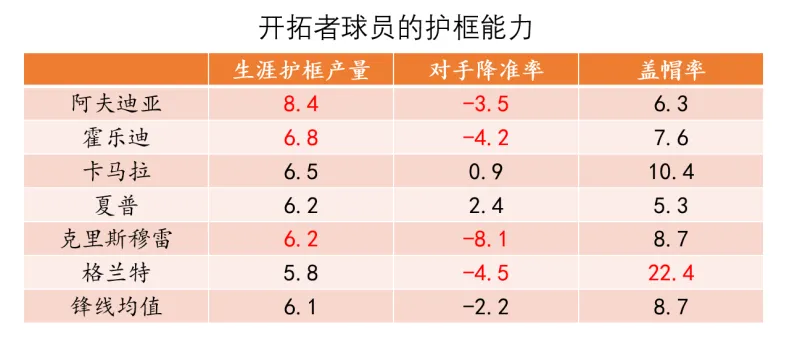 另一方面开拓者的锋线球员运动能力很强,有不错的护框能力,特别是昨天大量使用的5小并不会在防守端吃亏。如上表所示,阿夫迪亚职业生涯的护框产量远高于锋线平均水平且效果不错,霍乐迪在绿军时期也经常顶到锋线甚至内线参与护框,格兰特是锋线位置最优秀的盖帽大神,穆雷同样有着非常好的护框履历。当球队有这么好的护框资源时,中锋无论是用错防策略还是换防策略都是可行的。对于瀚森而言,在防守端我认为他需要“走出自己的舒适区”,就算是蹲坑防守也不要退得太靠近禁区,否则很容易遭到对手频繁的抛投针对。