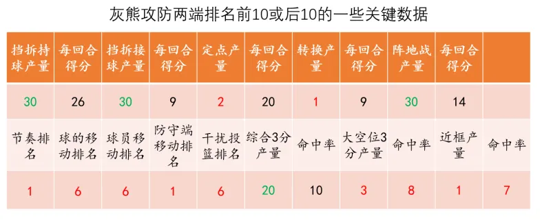 上表是25赛季灰熊在攻防两端排名前10或后10名的一些关键数据,可以看到他们是联盟最不爱打挡拆的球队,其进攻开发非常依赖于转换进攻,转换产量联盟第1、效率联盟第9、节奏联盟第1。与此同时他们非常强调球员和球的快速转移,进攻端球的转移速度和球员移动速度均为联盟第6,防守端移动速度更是联盟第1。此外他们的这种快速风格会产生大量的大空位3分机会,这是瀚森需要重点抓住的一点,尤其是在快攻过程中学会“拖后进攻在弧顶投3分”的技能。