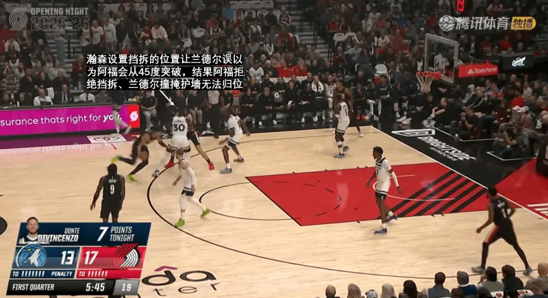 上图是在瀚森登场后的第一次挡拆配合,可以看到小杨的挡拆方向让兰德尔误以为阿夫迪亚会从45度角位置向禁区突破、同时还吸引了里德准备挡拆换防,结果阿夫迪亚迅速选择“拒绝挡拆”从中路突破轻松得分,与此同时兰德尔撞上了瀚森的掩护墙完全失位,这是阿夫迪亚与瀚森挡拆默契的体现。