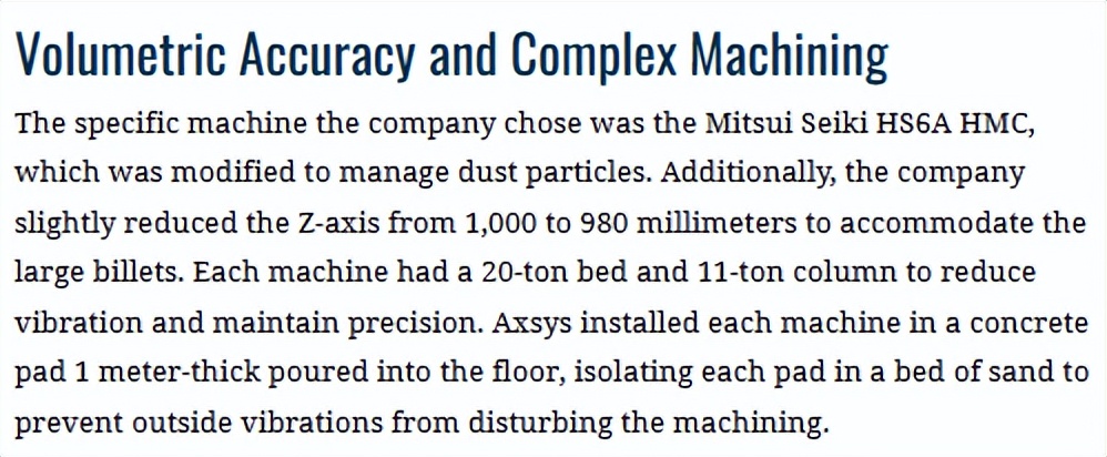 三井也确实下足了功夫,可以说面面俱到,铍材粉尘对工人健康有害,三井就做了封闭改装以管理粉尘颗粒;为了容纳大型坯料,三井就将Z轴从1000毫米略微减少到980毫米;为了减少振动并保持精度,三井就将每台机器增重,20吨的床身和11吨的立柱。