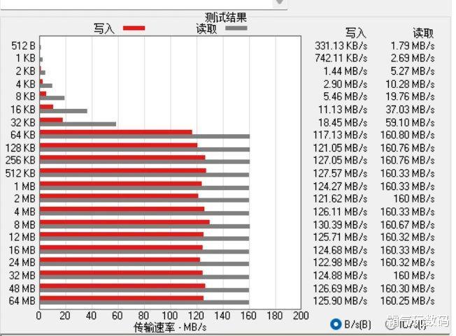 ATTO Disk Benchmark是由ATTO公司出品的一款磁盘/网络基准性能测试工具,分别从0.5K、1.0K、2.0K直到 1024KB进行读写测试。测试后数据结果会以直观的色彩条纹形式展现。 从测试结果中可以看出,平均速度基本上都在160MB/s以上,与官方的数据基本一致,速度确实爆表。