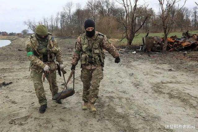 两名乌克兰排爆士兵在泥泞的河岸地带,协同搬运未爆弹药。