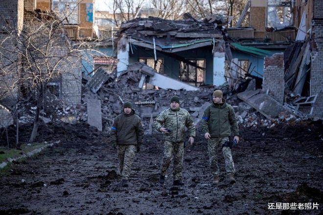 三名乌克兰军人手臂佩戴着蓝色识别带,是乌军前线用于敌我区分的标志性符号。背景是被炮火彻底摧毁的居民楼,墙体坍塌、瓦砾堆积、泥泞的地面与枯树,直观展现了城市战对民用设施的毁灭性破坏。