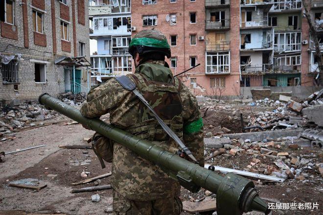 一名身着迷彩服、头戴绑有绿色布条头盔的乌克兰士兵,肩扛反坦克武器,背对镜头站在一片废墟中。背景是多栋门窗破损、墙体斑驳的居民楼,地面布满瓦砾与碎石,整体场景残破,他来自俄乌冲突乌克兰巴赫穆特(Bakhmut) 战区。