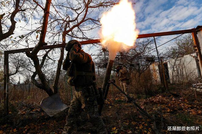 2023 年 11 月 8 日,乌克兰国民警卫队欧米茄特种部队成员在前线城镇阿夫季夫卡向俄罗斯军队发射迫击炮。 路透社 Serhii Nuzhnenko 摄