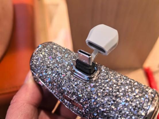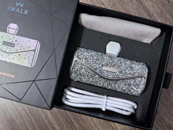 iWALK钻石二代胶囊充电宝的体积仅有77.4*53.8*26.5mm大小,也就比口红略微大一点,从正面看像是一只镶钻的迷你手提包。颜值和时尚方面,简直不要太拉风。