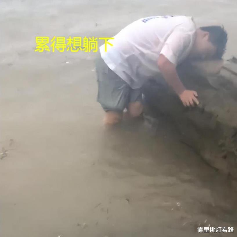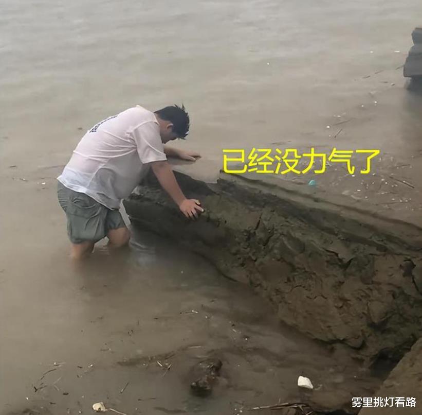 上岸后的男子已经耗尽了所有力气,他脚软得无法站立,只能扶着石头,站在水中稍作休息。这一刻,他感受到了久违的安全感,内心却已接近崩溃的边缘。