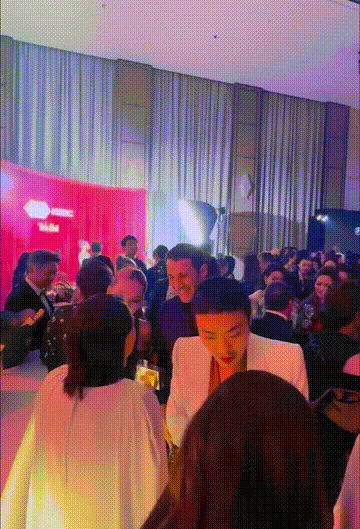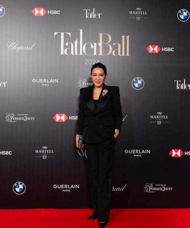珠宝艺术家赵心琦穿了一套黑色西装,她戴的大胸针就出自她的设计,她创立了珠宝品牌Cindy Chao,她在红毯上单手揣兜,她气场全开。
