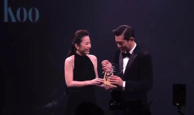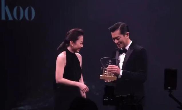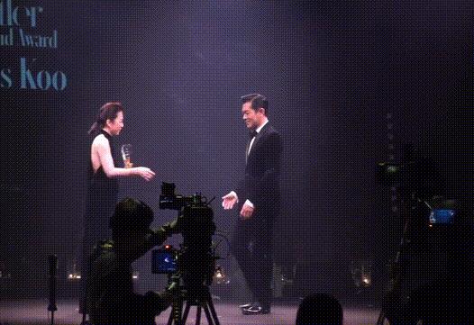 古天乐拿到了钻石终身成就大奖,甘比给古天乐颁奖,古天乐开心的走上台,他从甘比手中接过了奖杯,站在舞台上的古天乐好耀眼啊。