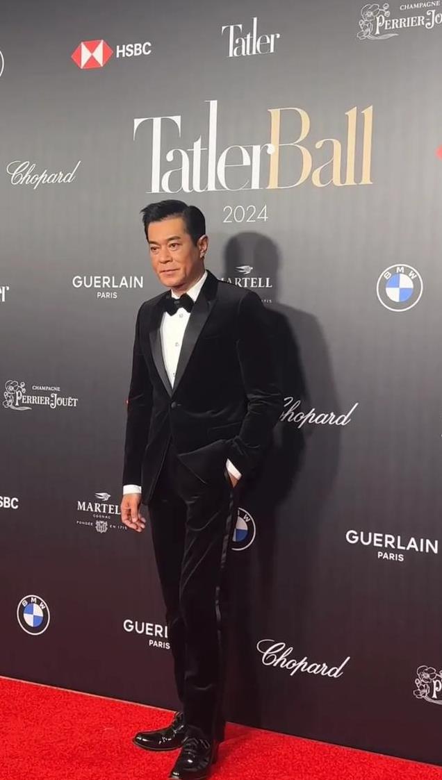 古天乐穿了一件黑色丝绒西装套装,他戴了一个黑色的领结,古天乐帅气的走上红毯。古天乐把手揣在口袋里,他虽然老了,但依然很帅,古天乐很自律,他一点都没有发福。古天乐在红毯上一脸严肃,当了老板的古天乐很有派头。
