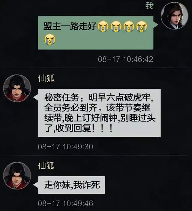 4044区仙湖宫盟主仙狐,为了夺取虎牢关,竟然散布自己因心梗离世的假消息。全区玩家深信不疑,共同商议停战三天为其"送行"。结果这老小子在内部群里突然"诈尸",下令凌晨六点秘密突袭。更绝的是,六点只是烟雾弹,真正的进攻时间是凌晨三点。可以说是“计中计”玩的是炉火纯青。