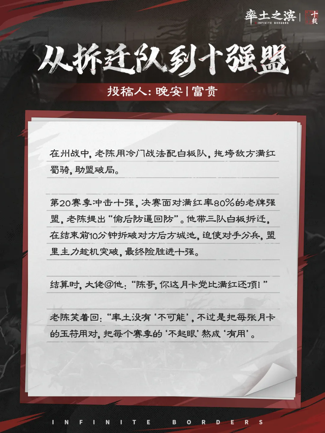 在"晚安|富贵"的故事里,月卡党老陈用冷门战法配白板队,硬是拖垮了敌方满红蜀骑。第20赛季冲击十强的决赛,面对满红率80%的老牌强盟,老陈提出"偷后防逼回防"的奇策。他带着三队白板拆迁,在比赛结束前10分钟拆破对方后方城池,迫使对手分兵,盟里主力趁机突破,最终险胜进入十强。
