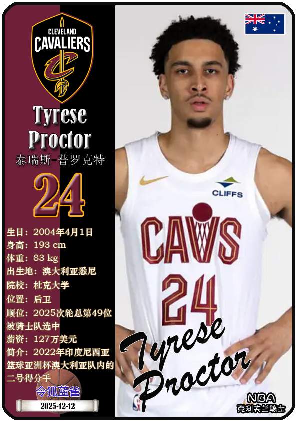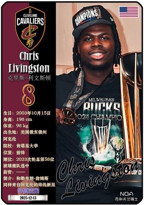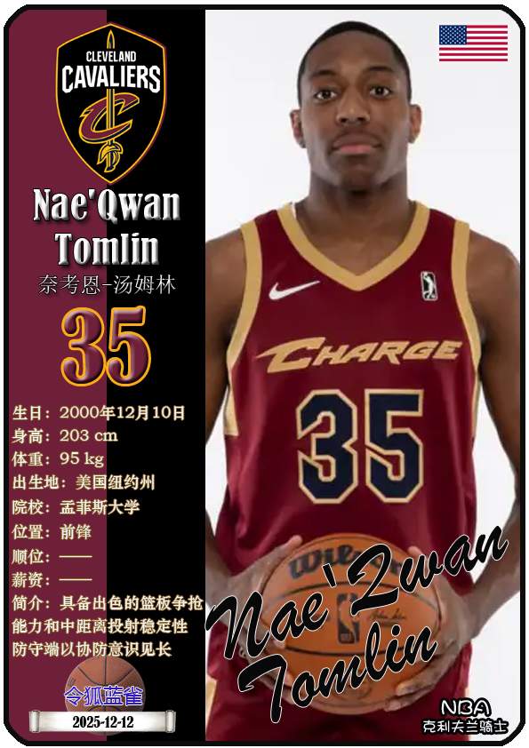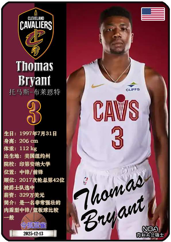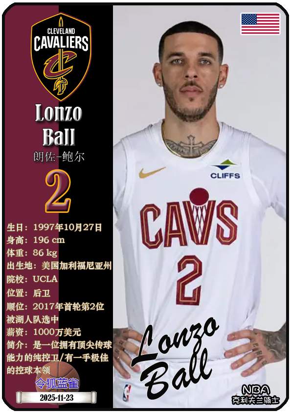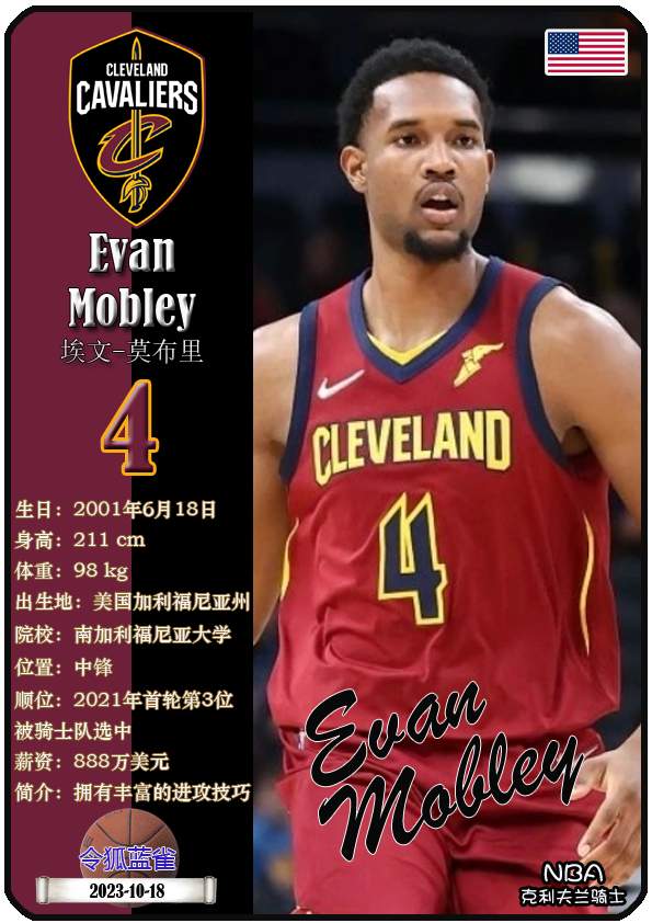 NBA克利夫兰骑士队成立于1970年,距今已有55年历史。截至2025年12月13日,球队主教练是肯尼·阿特金森,队内拥有球员多诺万-米切尔、埃文-莫布里、达里厄斯-加兰等。本期以球星卡的形式展示目前NBA克利夫兰骑士队的17名球员(按球衣号码排序):