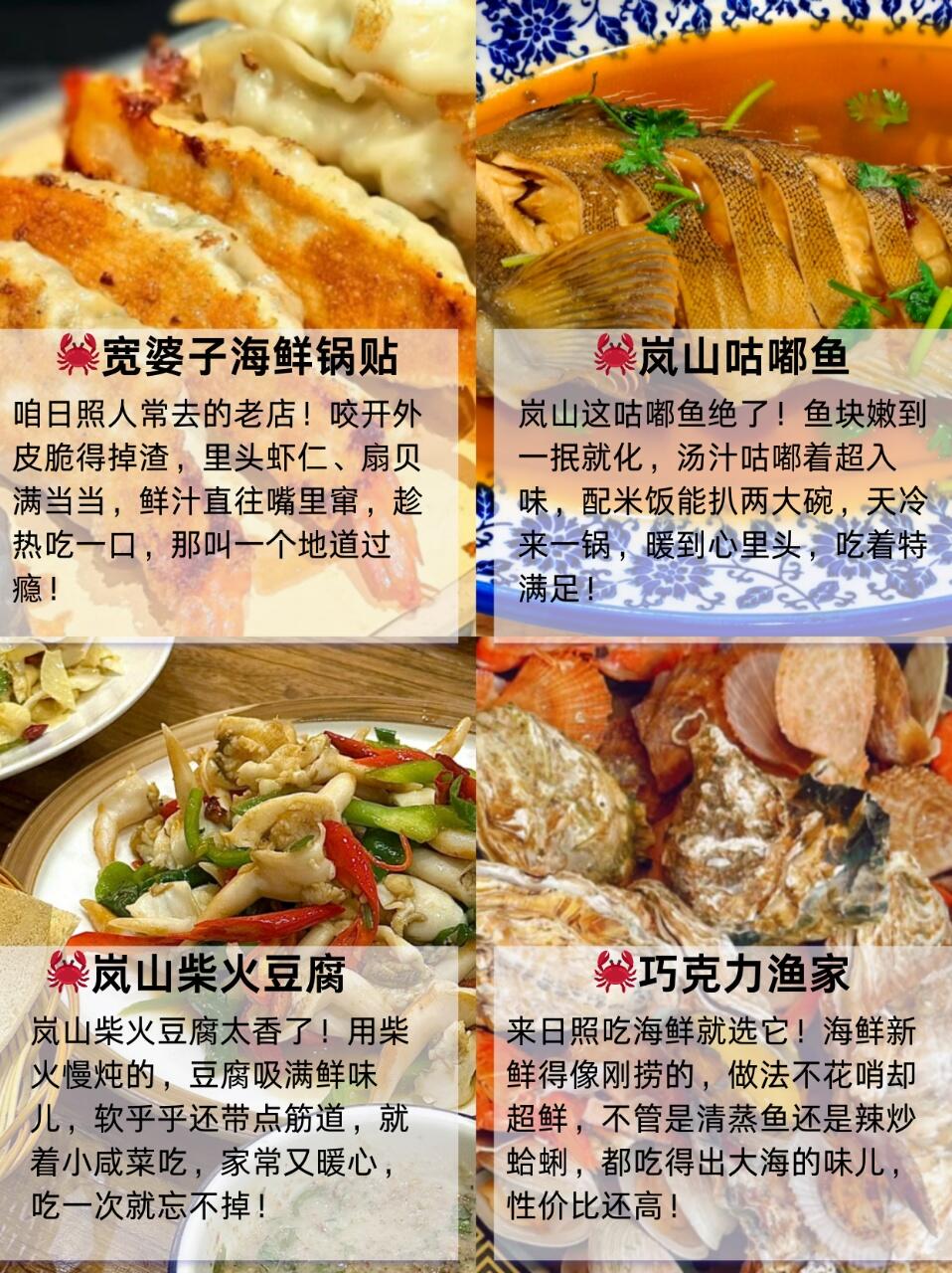 ✔️日照宽婆子海鲜锅贴:咱日照人常去的老店!咬开外皮脆得掉渣,里头虾仁、扇贝满当当,鲜汁直往嘴里窜,趁热吃一口,那叫一个地道过瘾!