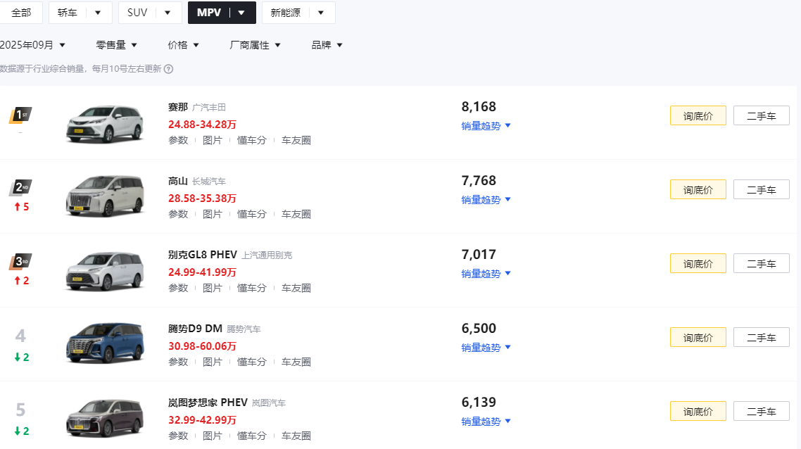 如果你有30万预算,并且考虑入手一台MPV的话,那么你大概率会出现“选择困难症”。从直观的销量数据上可以看到,排名靠前的MPV车型有家喻户晓的丰田赛那,同时也有后起之秀魏牌高山、采用插混动力的“老将”别克GL8,以及曾经连续霸榜的腾势D9 DM等等。