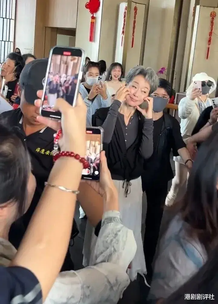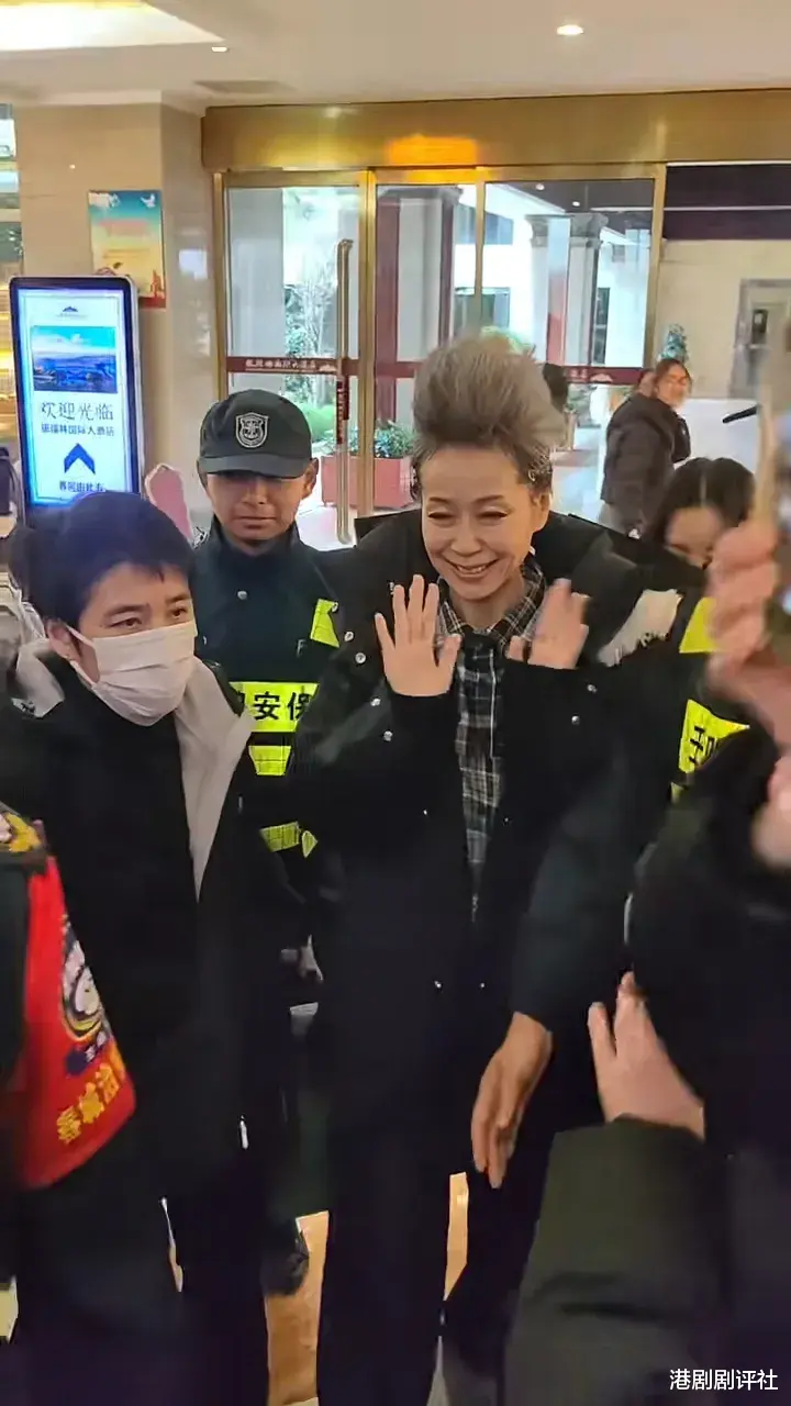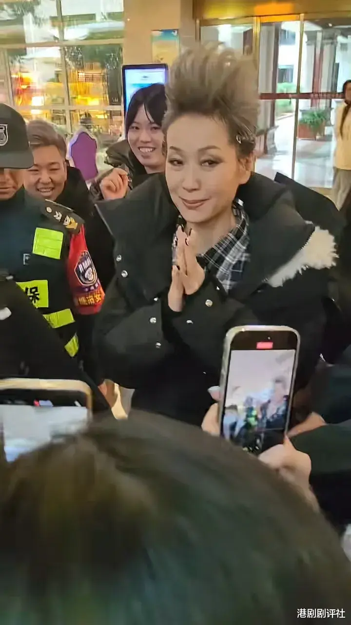 片中可见,叶童穿上黑白格纹衬衫及黑色羽绒外套,头上梳了目测约有7吋高的灰白髮型,造型非常奇特。她边行边跟现场粉丝挥手打招呼,大批粉丝围著叶童热情地举机拍摄,场面墟冚。不过见惯大场面的叶童就亲切地跟粉丝打招呼,非常亲民,在多名保安保护下顺利离开。