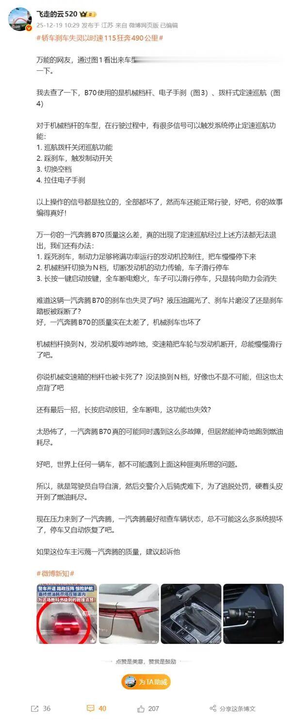 事件曝光后,迅速登上热搜,网友们除了惊叹“惊魂之旅”的惊险,更多的是满满的质疑。“太离谱了,汽车设计师早就考虑过这种情况,不可能所有停车方法都失效。”网友的质疑声中,博主“@飞走的云520”的分析尤为引人关注。他通过车辆细节判断,涉事车型为采用机械档杆、电子手刹和拨杆式定速巡航的一汽奔腾B70,并列出了四种可独立触发巡航关闭的操作,“这四种信号都是分开工作的,就算车辆质量再差,也不可能同时全部损坏,还能保持正常行驶状态。”