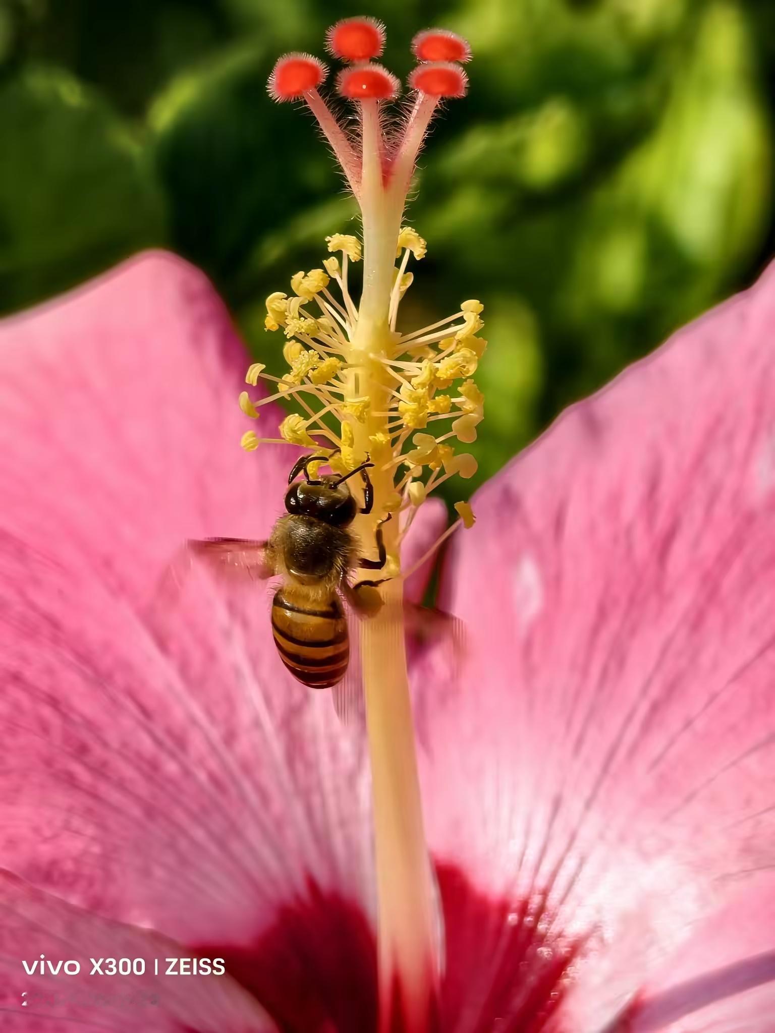 vivo X300拍摄色彩丰富协调,粉色花朵、黄色花蕊、蜜蜂色泽浓郁且真实。清晰