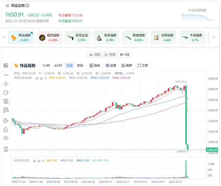 《CS2》游戏饰品市场剧烈震荡,总市场估值从59亿美元暴跌至42亿美元,一日蒸发17亿美元。高端饰品集体跳水,部分稀有道具如专业手套、蝴蝶刀等单日普遍跌超50%。这种东西好像隔一段时间就爆一个,球鞋、游戏饰品、那个玩偶……真是一代人有一代人的君子兰……