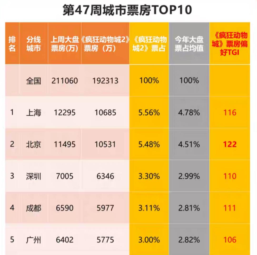 △ 上海、北京、深圳占据了《疯狂动物城2》票仓城市前三名