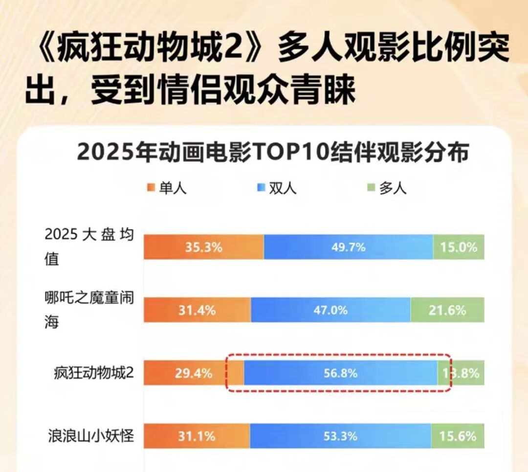具体来说,《疯狂动物城2》的观众群中,双人观影的占比高达56.8%,而这项数据在2025年所有动画电影中的均值为49.7%。