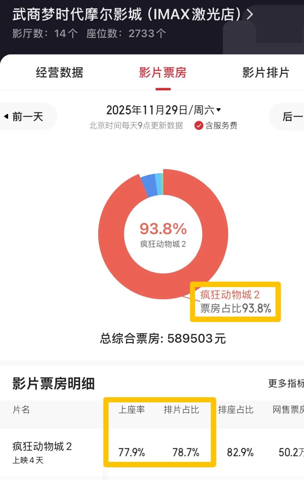 △ 武商梦时代摩尔影城上周六《疯狂动物城2》排片78.7%,上座率77.9%,单日单片票房55万+