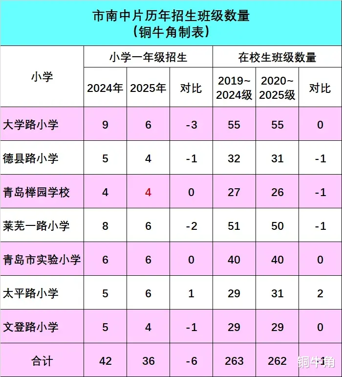 青岛市南中片7所小学2025年招生总数为36个班,继上一年一年级招生减少12个班之后,今年一年级招生再度减少了6个班。市南中片7所小学在校生总班级数为262个,同比减少1个班。总体而言,市南中片小学可能已经在不知不觉间,度过了在校生数量的最高峰。