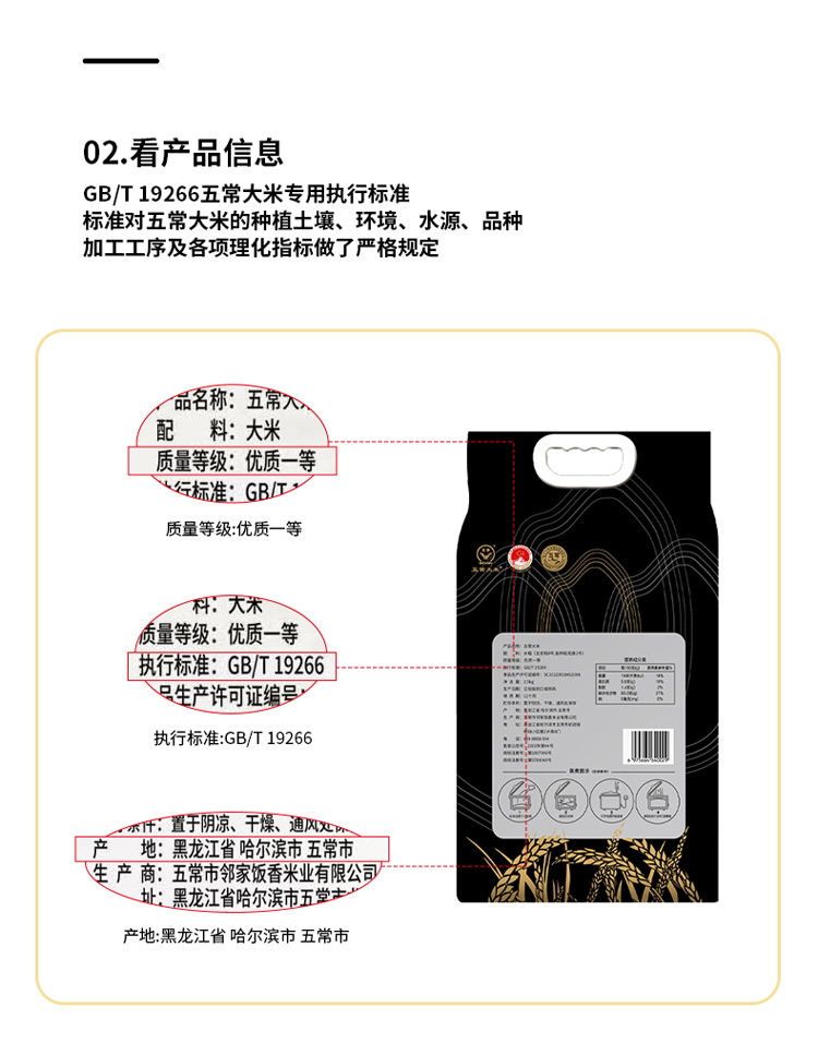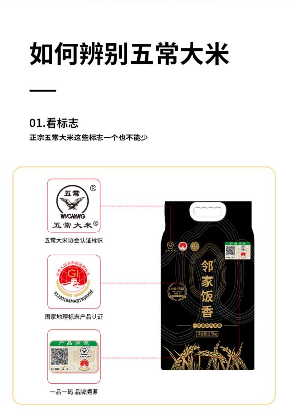 -包装标识:必须标注GB/T 19266(五常大米专用标准)。包装右上角应有五常大米溯源防伪码,扫码可查产地。