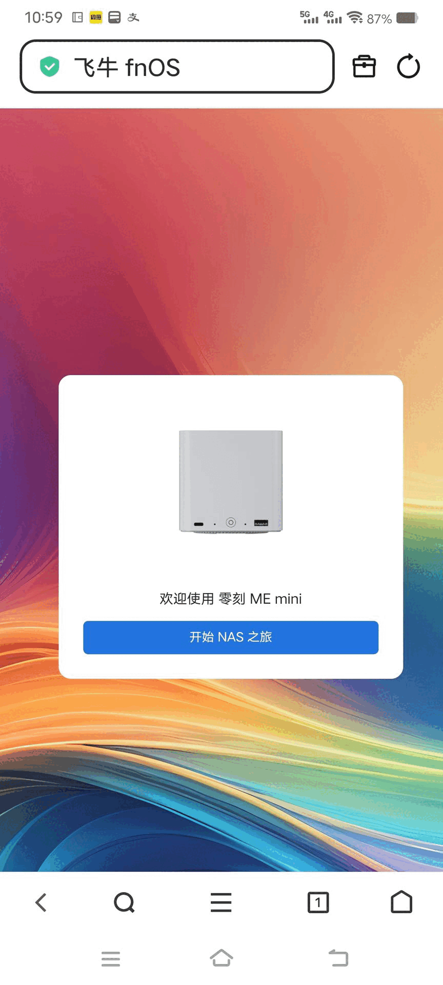 连接电源线、网线后,第一次开机,用户可以借助电脑、手机、平板等的浏览器,直接访问联名款ME mini的内网ip。自己定义设备名称(NAS服务器名称)、超级管理员的用户名、密码,稍顷即可进入飞牛系统桌面,这样就完成了系统的初始化。
