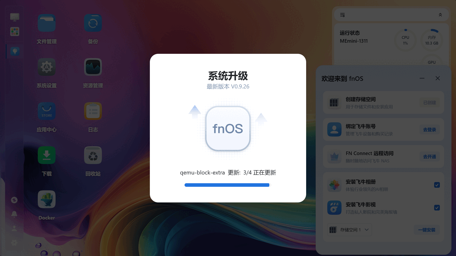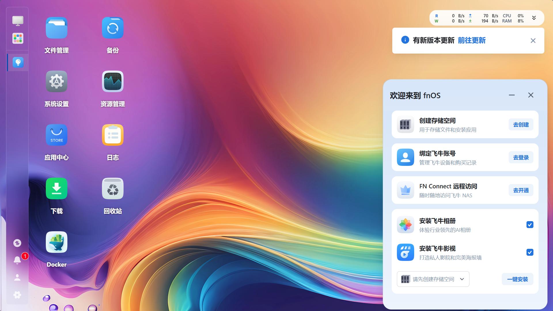 搭建1 - fnOS系统更新模拟小白家庭用户,跟着桌面的信息,一步一步来吧。先更新系统。