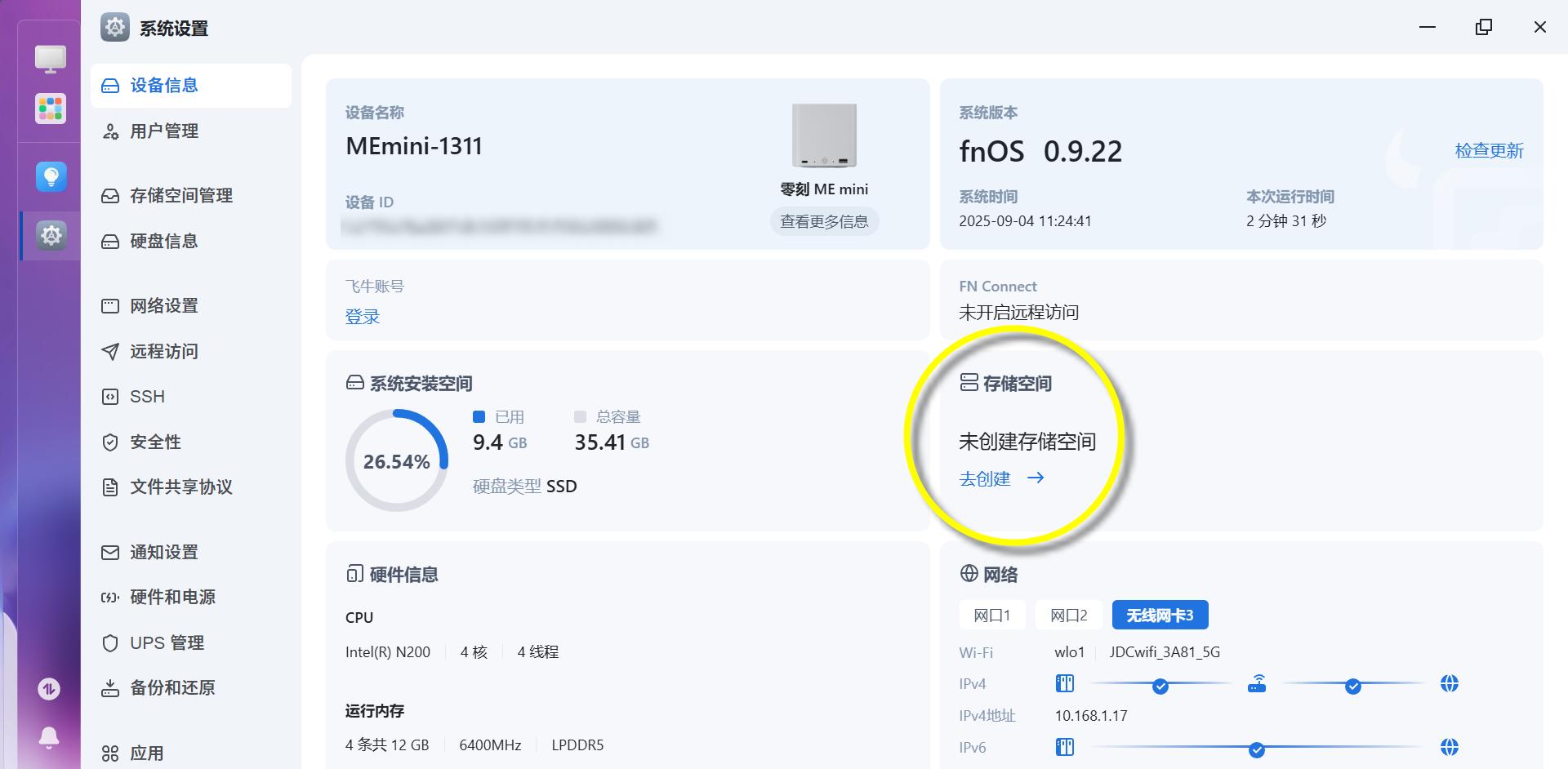 在成功连接家庭网络、Fn OS升级到最新版之后,搭建家用NAS的三个关键步骤就只剩下存储空间的创建了。这一点系统桌面也给了明显的提示(见图中黄圈)。