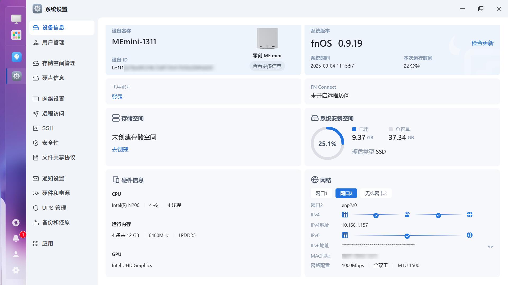 网口1、网口2、无线网卡3:飞牛系统完美识别和支持了ME mini的两个2.5G网口、WiFi6无线网卡。