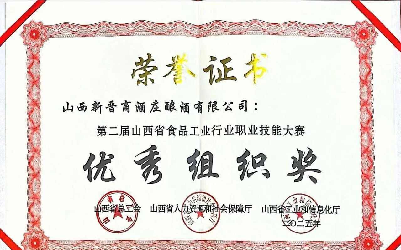 在会议同期举行的第二届山西省食品工业行业(白酒酿造工)职业技能大赛颁奖仪式上,新晋商酒庄集团再获荣耀。旗下两家企业——山西新晋商酒庄酿酒有限公司、山西杏花村汾 杏酒厂股份有限公司——凭借严谨的工艺管理与卓越的职业技能培养体系,双双斩获 “优秀组织奖”。