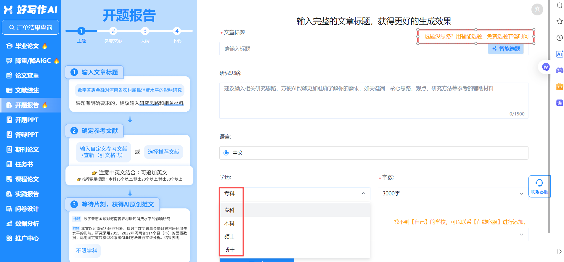 智能选题启发:输入你的专业领域和兴趣关键词,AI能基于海量学术数据,为你生成多个创新性研究视角和待解决的问题,帮你打开思路。
