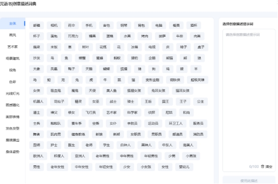 超高的用户体验:对于不会编写复杂的“咒语”的小白,易可图提供了专门针对新手的“咒语书”,里面包含了数以万计的画面主体、艺术风格、构图角度、光影效果等等相关的描述词汇,你可以通过这些词语来拼接出想要的画面内容,这样就大大降低了普通人的使用难度。