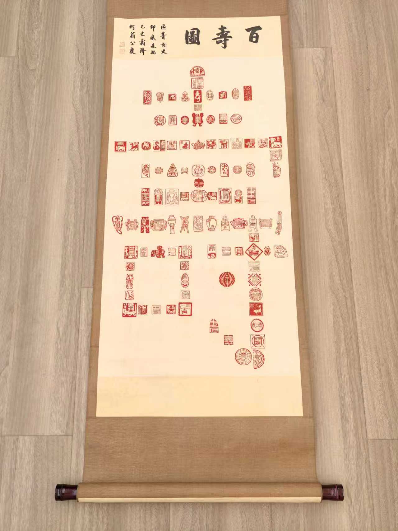 朱印落纸,墨字题篇,这轴《百寿图》早已超越了"作品"的边界:是曹公度笔底的文人余绪,是区菁三十年的刀石深情,是黄檗文化跨海东传的当代回声,更是两国以艺术为桥的一次对谈。百寿不是一百个字,而是一百年的心意——它藏着东方文化最温厚的祝福,是越山跨海仍相通的审美,是一纸一印间,永不褪色的文明共情。