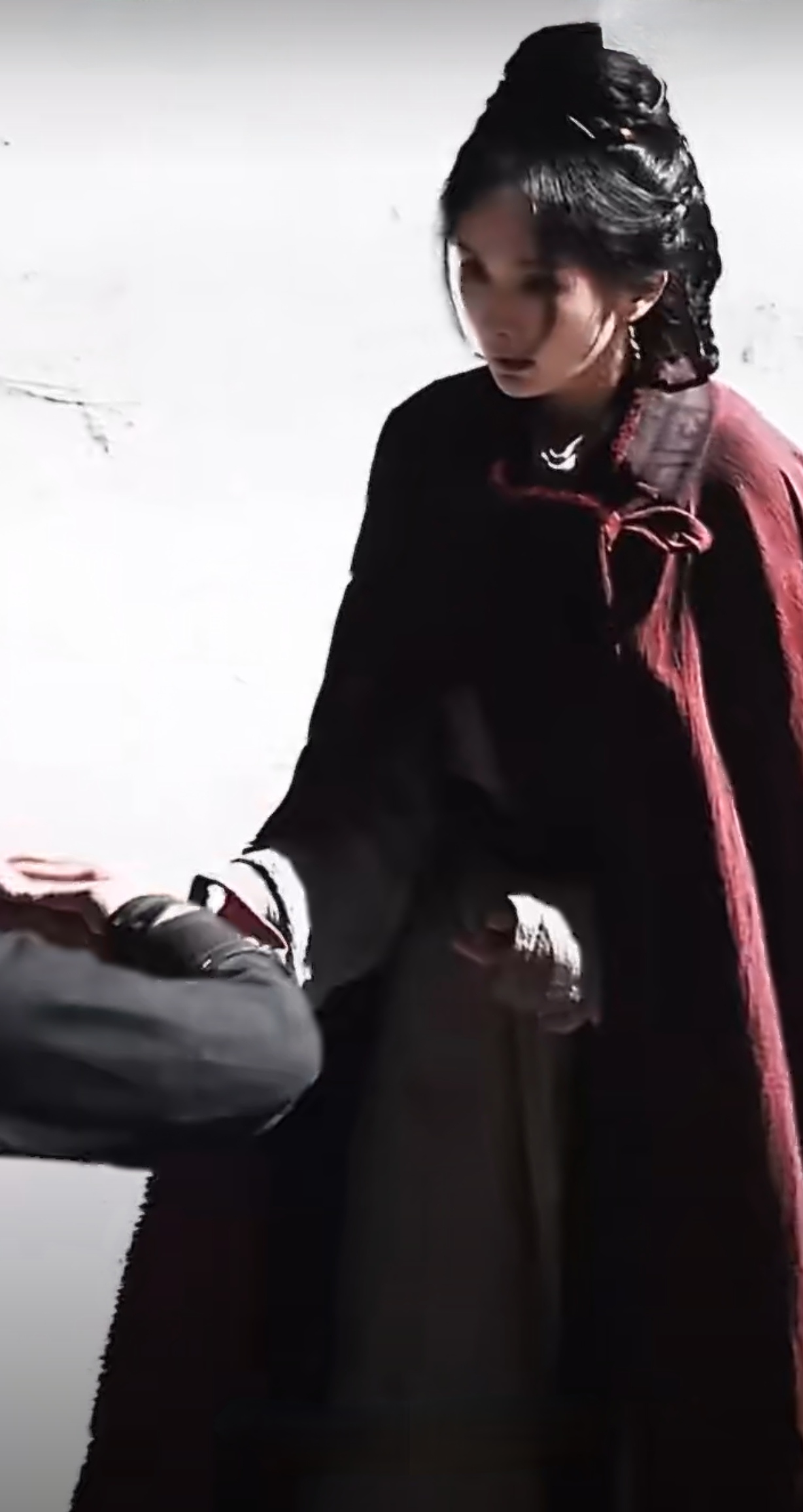 你看她那眼神,既有闯荡江湖的凌厉,又有身不由己的柔情,就这几个镜头,角色的故事感直接拉满。再看这红麻衣,不是那种俗艳的红,麻料的质感显得特别高级,既符合江湖儿女的设定,又自带一股清冷劲儿,这审美在线的服化道,谁看了不夸一句用心?