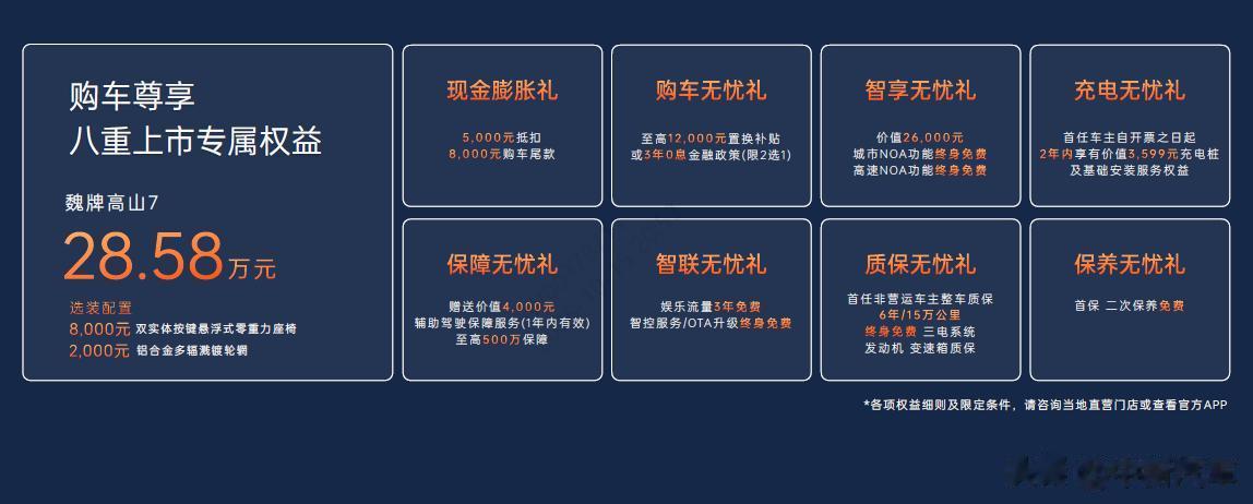 为让用户轻松畅享豪华家庭出行,高山7不仅拥有诚意满满的价格,更准备了包含“5000元抵扣8000元购车尾款”、“至高12000元置换补贴或3年0息金融政策”、“价值26000元的城市及高速NOA功能终身免费”等丰厚的八重上市专属权益。